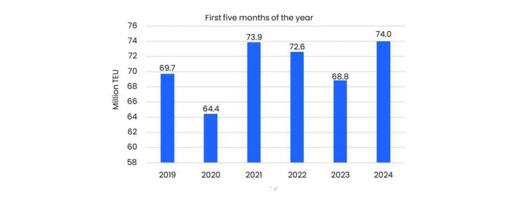 Il livello record della domanda di maggio porta i volumi dall'inizio dell'anno a poco meno di 74 milioni di TEU, con un aumento del 7,5% rispetto ai primi cinque mesi del 2023.